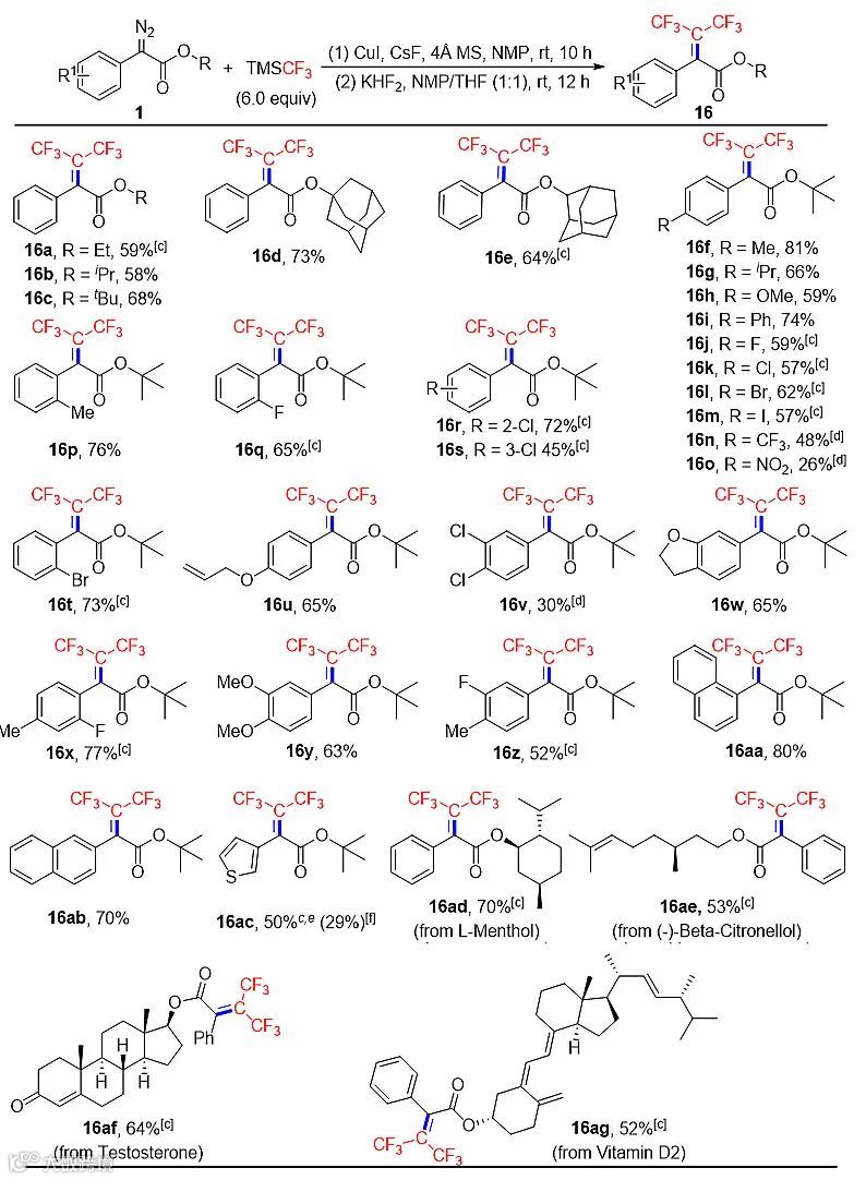 图4. 铜催化下对α-重氮酸酯的偕双三氟甲基烯基化反应底物拓展[a][b]