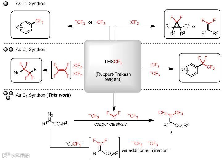 TMSCF3是一种应用广泛的三氟甲基化试剂,其可以作为多种不同含氟碳片段的前体,参与到各类反应中(图1)。作为C1合成子,其可作为三氟甲基负离子,三氟甲基自由基和二氟卡宾来源;之前,胡金波课题组曾把TMSCF3作为C2合成子,即以TMSCF3为原料产生二氟卡宾进而二聚形成四氟乙烯,实现四氟乙基化反应和五氟乙基化反应(Angew. Chem. Int. Ed., 2017, 56, 9971);另外,TMSCF3还能在调控下经历二氟卡宾插入过程生成CuC2F5 (Angew. Chem. Int. Ed., 2018, 57, 13211)。在本工作中,作者将TMSCF3作为两个三氟甲基前体和一个类二氟卡宾前体,拓展了TMSCF3作为C3合成子的用途。