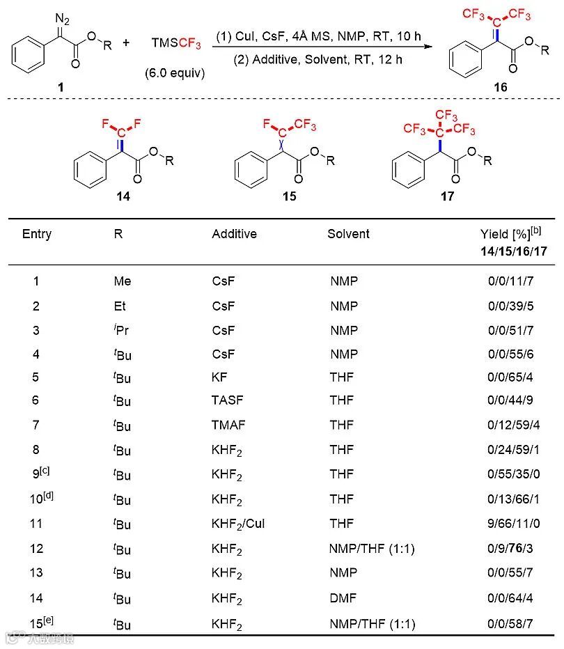 图3. 铜催化下对α-重氮酸酯的偕双三氟甲基烯基化反应条件筛选