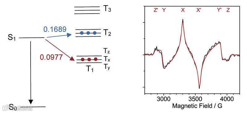 该团队通过时间分辨顺磁共振波谱(TREPR)以及理论计算研究了ISC过程在三重激发态分能级上的选择性布居,从而解释了这种无重原子化合物的ISC机制主要是由具有扭曲结构的BODIPY分子的对称性降低所导致。理论计算分析表明,由C2V点群(分子具有平面结构,SOC = 0)向C2点群(分子具有扭曲结构)的转变,增强了S1与T1/T2态中的Tx分能级的自旋轨道耦合 (SOC),使原本禁阻的ISC过程成为可能。TREPR为该理论提供了实验证据:TREPR结果表明,在T1态的三个分能级中,Tx分能级是过量布居的 (Px: Py : Pz = 1 : 0 : 0.2)。