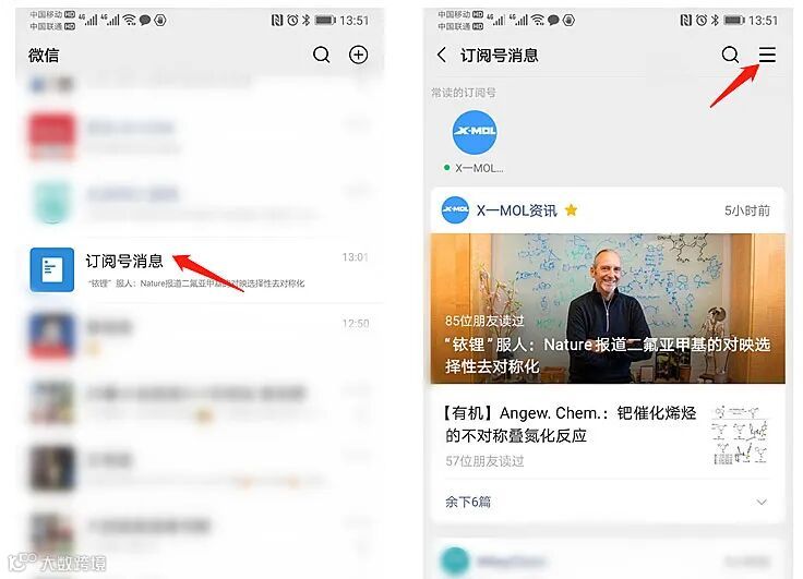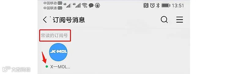 想看的时候,手机微信里进入“订阅号消息”→点击右上方“≡”,就能看到盖了戳的“X-MOL资讯”。