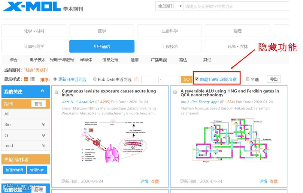 应广大用户朋友的要求,我们利用五一假期为期刊版块新增了一项功能,可以让大家在浏览文章的时候,把一小时前浏览过的文章隐藏掉,只显示尚未浏览过的文章。