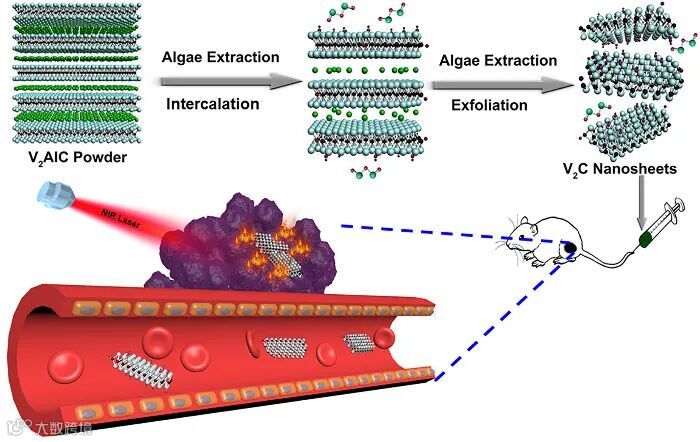 二维碳化钒纳米片作为光热试剂在癌症的光热治疗中具有非常大的潜力。但是,苛刻的合成条件和低的光热转换效率限制了碳化钒在光热治疗中的应用。近日,北京科技大学的董海峰教授团队和深圳大学张学记教授团队报道了一种绿色的制备方法,利用藻类提取物通过插层法制备出了高产率的二维碳化钒纳米片。