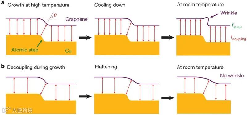 要找到解决办法,先要了解传统CVD法制备石墨烯产生褶皱的原因。由于石墨烯与生长基底(例如铜或铂)的强耦合作用,同时石墨烯和基底的热膨胀系数并不匹配,导致在数百摄氏度高温下生长而得的石墨烯在制备完成后降至室温过程中,释放压缩应变,很容易产生褶皱。因此,尝试减弱石墨烯与生长基底之间的相互作用,可能是解决这一问题的关键。