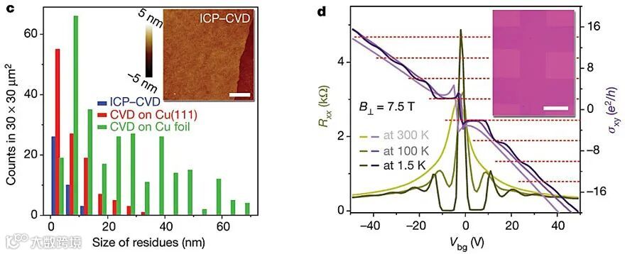 超平石墨烯薄膜的量子霍尔效应及易清洁能力。图片来源:Nature