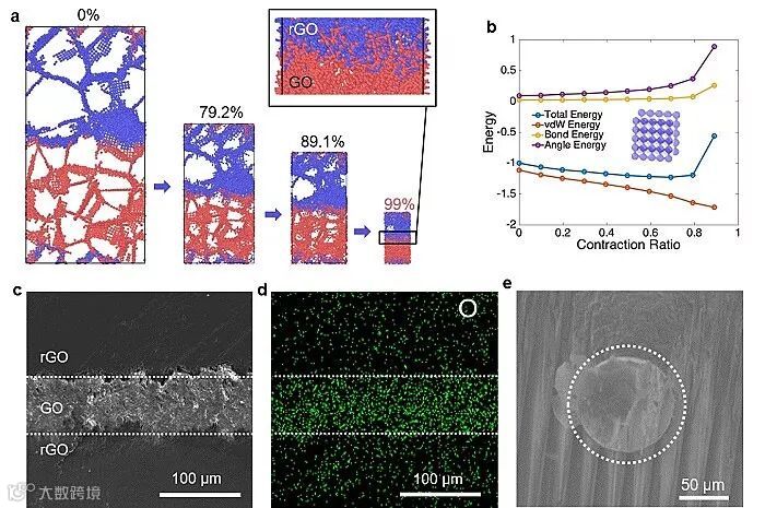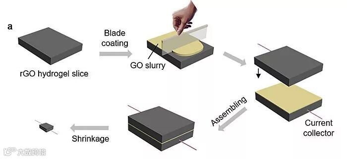 在自发脱水收缩过程中,水凝胶内部水与石墨烯片层,以及片层与片层间强的相互作用力导致了石墨烯片的褶皱、堆叠,体系能量不断降低,体积减小。最终,弯曲褶皱带来的角能量大幅度升高,体系整体能量增大,收缩停止。收缩过程中,GO黏浆层受限于上下两面的水凝胶,将随之一起收缩,结果得到致密规整的三明治结构电容器。在此过程中集流体也将被牢固限制在电极材料中,器件结构非常稳定。