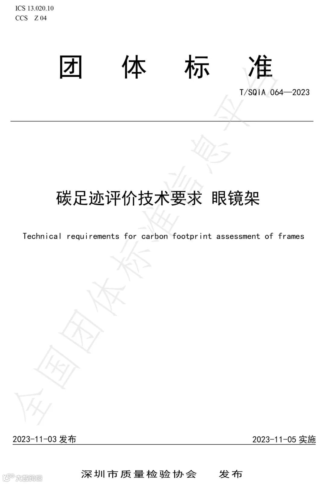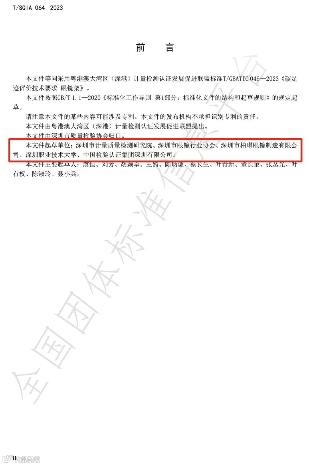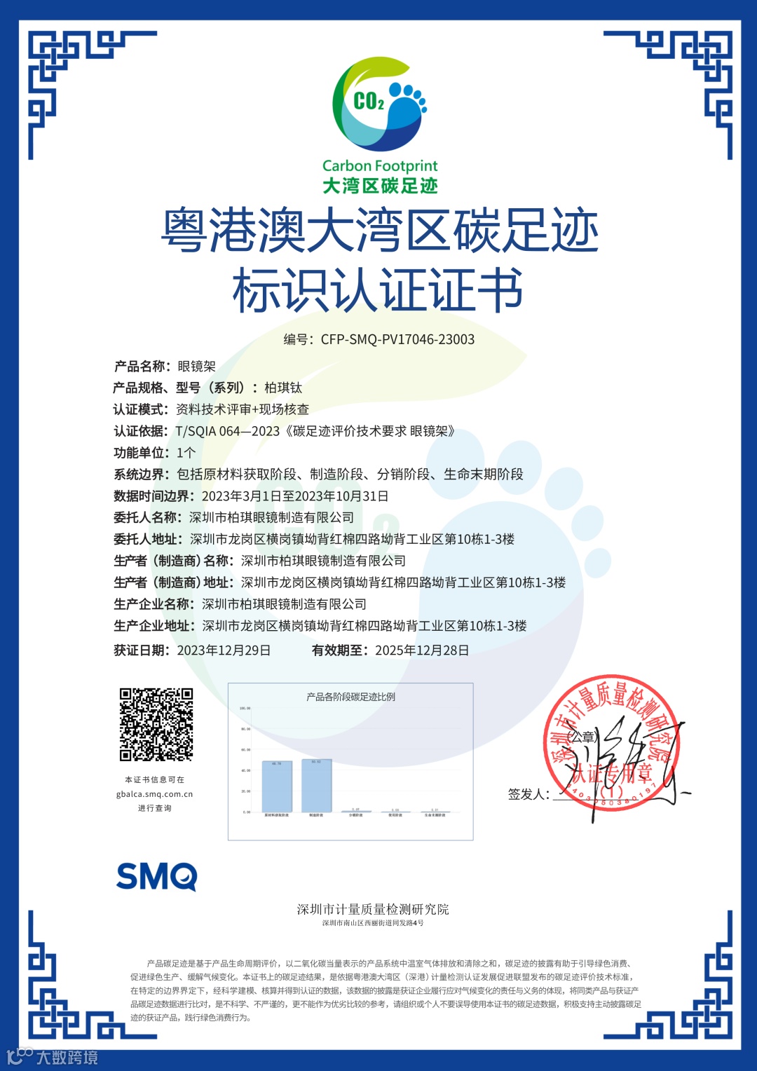 认证依据的团体标准T/SQIA 064—2023《碳足迹评价技术要求 眼镜架》,由深圳市柏琪眼镜制造有限公司参与联合编制。