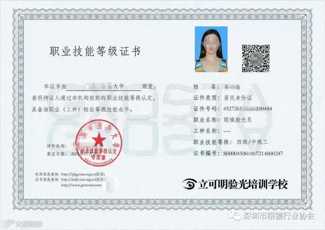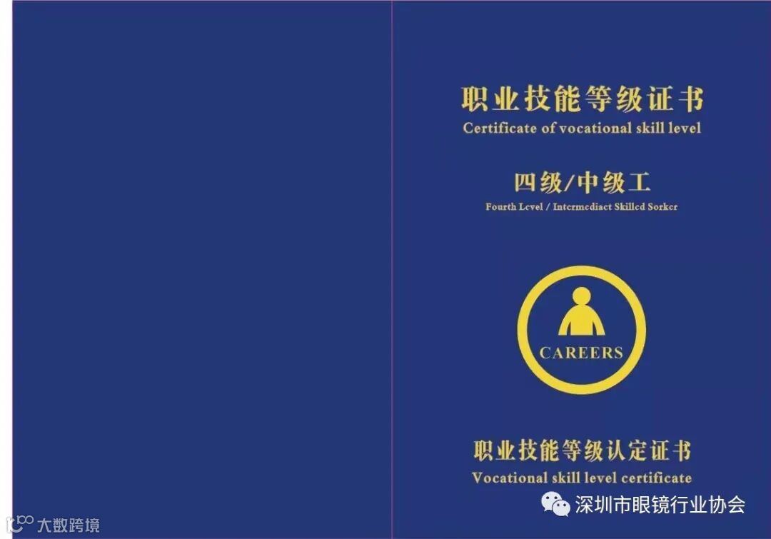 国家职业技能等级认定(原国家职业资格证)的《中级验光员》、《中级定配工》