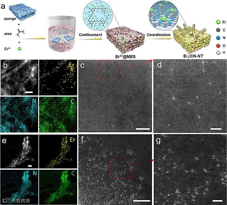 最近,清华大学王定胜课题组与黑龙江大学王国凤课题组合作发展了一种新颖的原子限域配位策略,在氮化碳纳米管上成功地制备出稀土Er单原子催化剂。该合成策略不仅可以实现对单原子Er浓度的调控,同时作者还将该策略拓展到其它稀土单原子催化剂的合成,从而丰富了单原子催化剂的元素类型。此外,作者首次将单原子Er催化剂应用在光催化CO2还原反应中,通过实验与理论相结合,证实了单原子Er在光催化CO2还原反应中的关键作用。这项工作对稀土单原子催化的科学认识和实际应用具有一定的推动作用,也为提高催化反应性能提供了一种新的途径。上述相关成果在线发表于Angew. Chem. Int. Ed.。