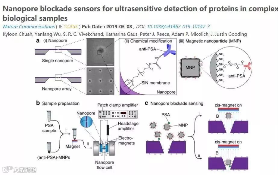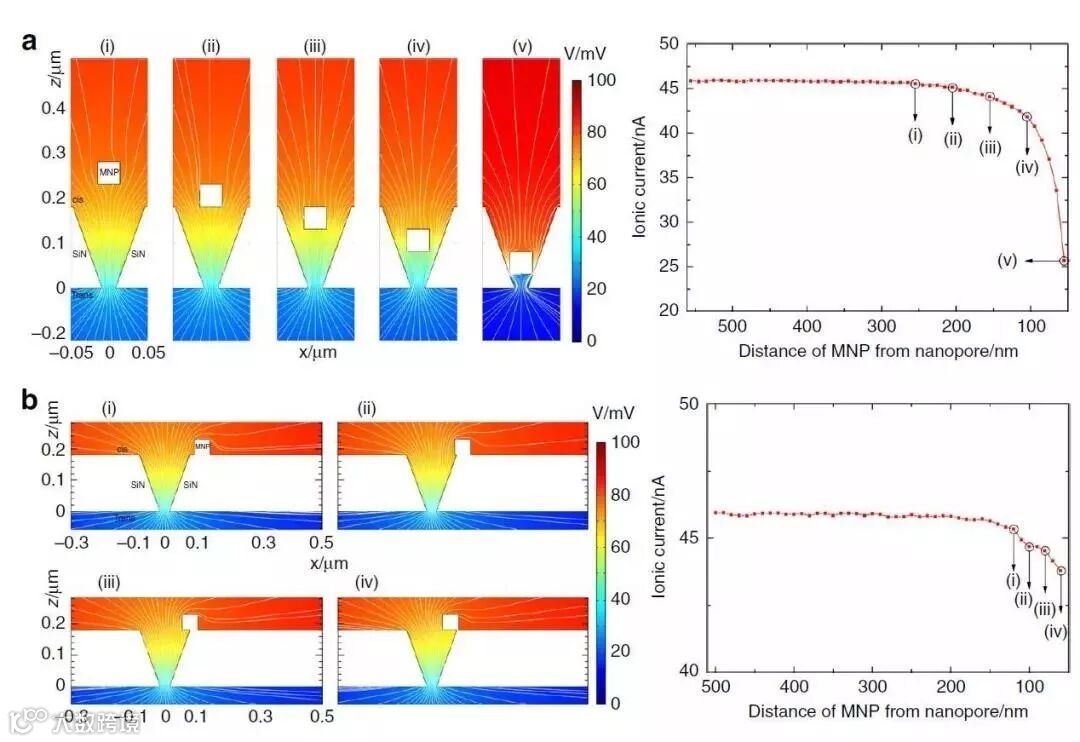 Nature Communications上发表了一篇生物物质检测的论文,题为“纳米孔阻滞传感器用于复杂生物样品中蛋白质的超敏检测”。此论文中,作者使用了Comsol软件的三个模块,分别是AC/DC 模块去模拟静电效应,利用化学物质传输模块去模拟K+离子和Cl-离子的稀释物质传输,利用流体流动模块去模拟层流速度分布。这三个模块的结合用于模拟纳米孔内的例子电流密度,用于作为磁性纳米颗粒与纳米孔之间距离的函数。