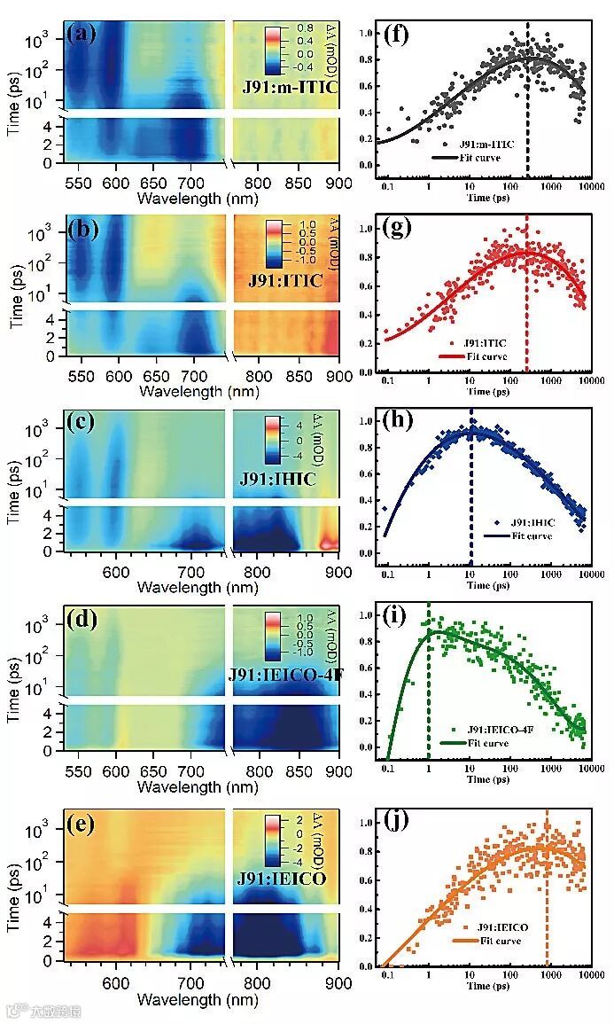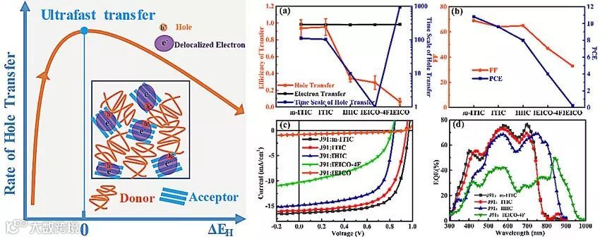 非富勒烯材料因其高消光系数、能带可调等优势而受到关注,然而材料光学带隙和有机太阳能电池的开路电压等问题限制了器件效率的进一步突破。传统有机太阳能电池中存在的较高能量损耗起源于有机半导体固有的低介电常数,需要额外的驱动力促使光生激子解离。而对于非富勒烯有机太阳能电池,给体和受体之间的能量偏移接近零时仍然可以实现较高的器件性能,这意味着不需要大的能量偏移驱动激子解离。目前对非富勒烯受体空穴转移过程理解不够清晰,相关物理图像如受体激子解离、空穴转移等仍较为模糊,激发态动力学与能级偏移之间等关键因素之间的联系缺乏定量研究,这极大的限制了该领域的进一步发展。