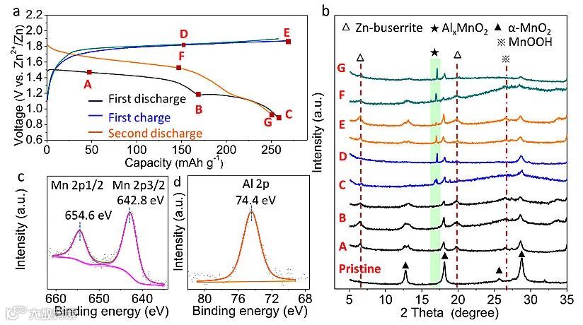 图2.(a)双阳离子水系Zn/MnO2电池充放电曲线图;(b)α-MnO2电极在不同充放电状态下的ex situ XRD图;α-MnO2材料首次充电后的(c)Mn 2p和(d)Al 2p XPS光谱图。