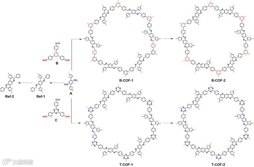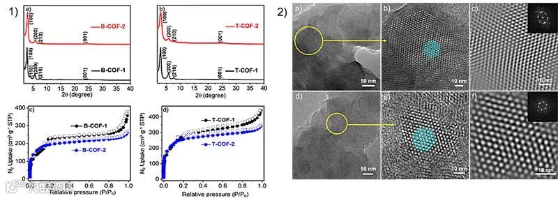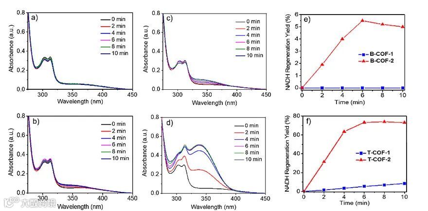 团队研究人员在前期全共轭二维、三维COFs制备基础上(Angew. Chem. Int. Ed., 2019, 58, 5376; J. Am. Chem. Soc., 2018, 140, 10016),设计和合成了含有噻吩基团的对苯二胺单体,通过希夫碱反应制备了B-COF-1和T-COF-1,然后在三氟乙酸催化下氧化成环实现连接单元转变得到B-COF-2和T-COF-2。红外光谱和固态碳谱确认了连接单元的成功转变,高分辨率透射电子显微镜(HR-TEM)则清楚地证实了其蜂巢状孔结构。X射线粉末衍射(PXRD)与结构模拟数据表明这类COFs材料均采取AA层状堆积。得益于材料的共轭结构,B-COF-2和T-COF-2的光催化活性得到了显著提升,NADH再生效率分别在10分钟内达到5.5%和74%。