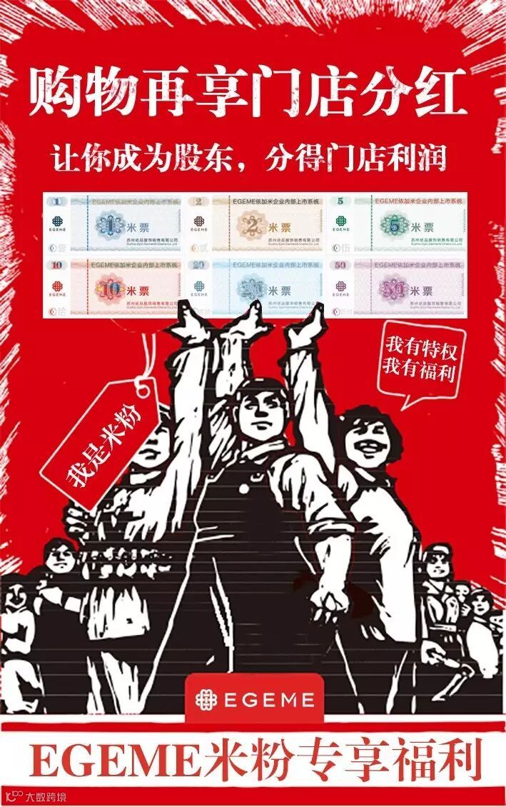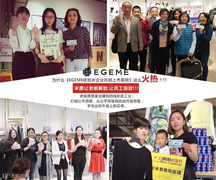 米票—是EGEME依加米企业内部上市系统的管理工具。让持有米票的顾客和员工不花钱拥有公司的分红权,让顾客成为股东,让员工得到工资额外的收入!小小的米票把顾客、员工、老板联动到一起,让全世界的女人更美丽!