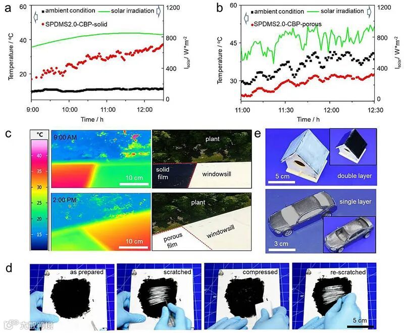 在实际的应用测试中,该智能多孔薄膜材料表现出优异的热控性能。在寒冷的天气中,以周围空气温度为〜10°C的环境为例,该双层可切换多孔薄膜可在795 W•m-2的平均太阳照射强度(Isolar)下实现自身表面温度升高〜18°C(图2)。而在炎热环境中,以空气温度为〜35°C的环境为例,在入射太阳辐射为768 W•m-2的情况下,处于多孔状态下的薄膜材料可以引起的自身表面温度下降(ΔT)为〜5°C。除此之外,加热和冷却之间的切换甚至可以在同一天的不同时间段进行。除了具有出色的冷却和加热性能外,该材料的制造方法也很简单方便且可扩展。双层可以制成坚固的自支撑膜(抗张强度:6 MPa,拉伸应变:> 100%),也可以通过喷涂或浇铸方法用作各种基材的涂层。由于SPDMS对刮擦具有很高的敏感性,因此即使将双层涂层应用到诸如陶瓷(用于建筑的材料)之类的刚性基材上,也很容易在冷却状态和加热状态之间切换双层涂层。