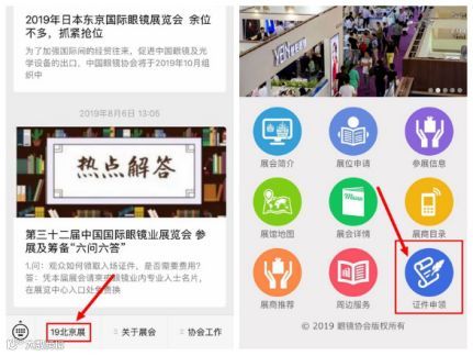 请在本微信公号中点击左下角位置“19北京展”,进入九宫格菜单后,点击“申领证件”按钮。