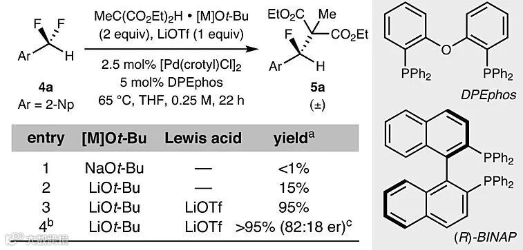 由此可见,采用这种“推-拉”活化的方式能够对烯丙位二氟亚甲基进行选择性的C-F键活化,那么对活性较低的苄位C-F键效果如何呢?可喜的是,2-(二氟甲基)萘在[Pd(crotyl)Cl]2、DPEphos和LiOTf的作用下与甲基丙二酸二乙酯•LiOt-Bu复合物反应,能以> 95%的收率和82:18的er值转化为单氟化合物5a。