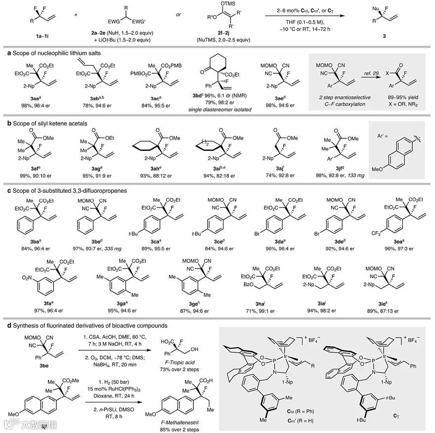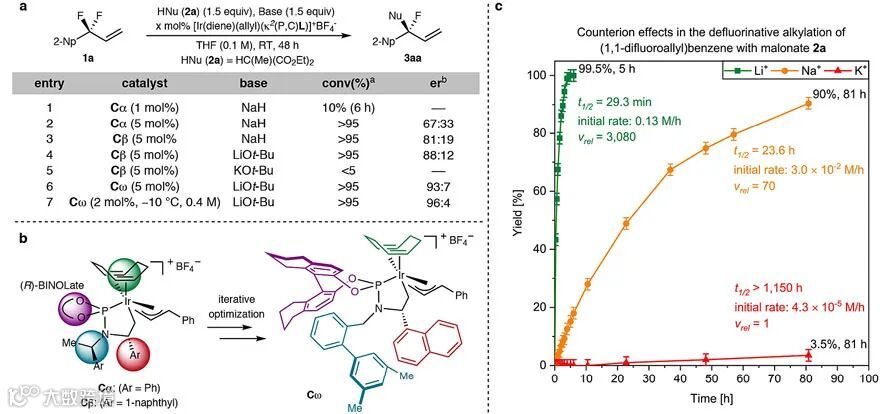 首先,研究人员以2-(1,1-二氟烯丙基)萘(1a)为底物进行条件优化。在铱催化剂Cα(1 mol%)作用下与甲基丙二酸二乙酯的钠盐(从NaH制备)反应6 h后,能以> 99:1的er值转化为目标产物3aa,但收率仅10%,延长反应时间并增加催化剂用量能提高收率,但对映选择性明显降低(er 值:67.1:32.9,下表entries 1和2),而改用催化剂Cβ能稍微提高er值(81:19,下表entry 3)。这使得作者考虑是否“拉”的效应还不够强,因此进一步筛选亲氟活化剂。值得注意的是,当用丙二酸锂进行反应时,反应速率要比钠盐快44倍(对映选择性(88:12 er vs 82:18 er)也稍好,下表entry 4),比钾盐快3080倍(下图c),这表明抗衡离子有助于C-F键的氧化加成。通过改变催化剂的结构和反应条件,最终获得最优条件——即2 mol%催化剂Cω、叔丁醇锂和-10 ℃——er值提高到96:4(下表entry 7)。