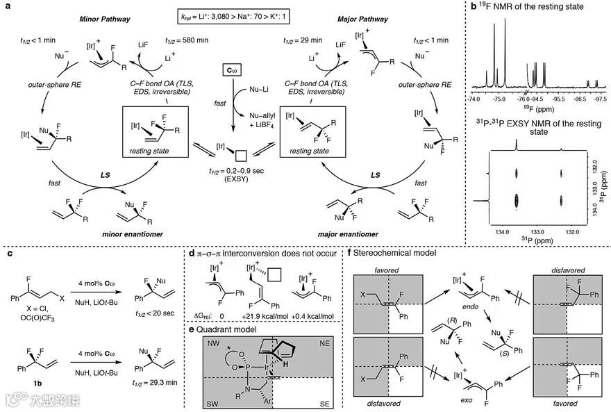 要想探究反应机理,必须要搞清楚速率控制步骤、对映选择性控制步骤以及绝对构象的起源。首先,研究人员分析了催化剂和底物组成的静息状态(resting state)的19F和31P NMR,结果显示为80:20的非对映体混合物,并且互变非常快(t1/2forward= 0.88s和t1/2reverse= 0.23s)。静息状态经C-F键的氧化加成生成π-烯丙基中间体,后者与丙二酸酯锂盐的反应也是非常快(t1/2< 20 sec),在2 min内就能达到> 98%的转化率,因此这两个过程都不是决速步。另外,催化剂Cω与丙二酸酯锂盐反应迅速形成Ir(I)物种,即使延长反应时间,也不与副产物氟化锂发生反应。这些数据暗示C-F键的氧化加成可能是决速步。