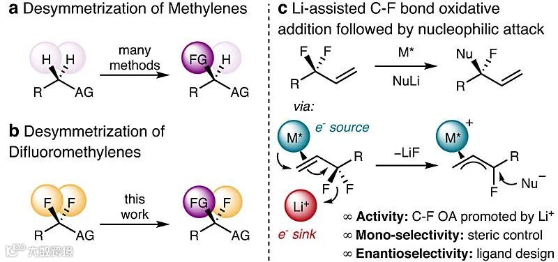 氟是药物化学家最喜欢的原子之一,尽管体积与氢差不多,但其生物效应却可能对候选药物的物理化学性质、代谢稳定性、透膜性等产生神奇的变化。然而,与C-H键不同(可通过均裂或异裂进行活化)的是,C-F键由于键能太高几乎不能被均裂。同样的,由于键能高、氟离子的碱性强,通常需要强Lewis酸才能发生C-F键异裂,这也与药物化学家利用氟原子屏蔽易代谢位点是一致的。另一方面,对C(sp3)-H键进行对映选择性官能团化已有相当成熟的方法,比如羰基α-位不对称锂化、苄位不对称C-H键活化、卡宾插入或氮宾插入以及导向的C-H键活化等等(下图a)。然而,对偕二氟亚甲基单元进行对映选择性的取代单氟原子尚未见报道,这是因为这样的C-F键具有更高的键能。