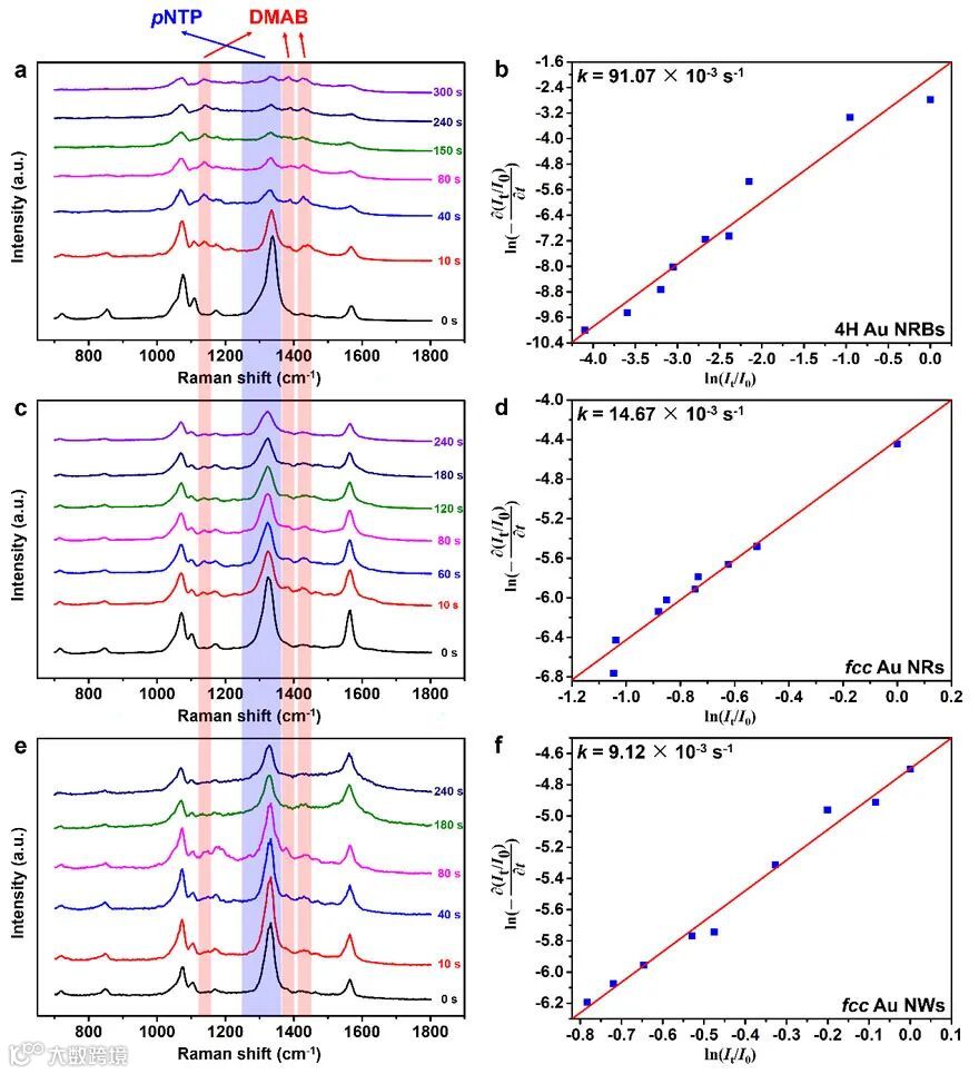 图2. 利用原位SERS追踪pNTP在(a,b) 4H金纳米带, (c,d) fcc金纳米棒和 (e,f) fcc金纳米线上发生光催化反应转换为DMAB和对pNTP消耗的动力学拟合。