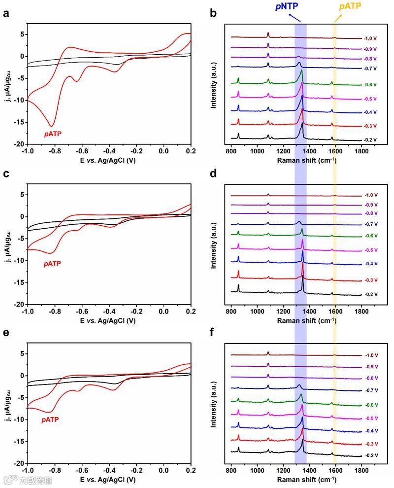 图3. 利用原位电化学SERS追踪pNTP在(a,b) 4H金纳米带, (c,d) fcc 金纳米棒和 (e,f) fcc 金纳米线上发生电催化反应转换为pATP。