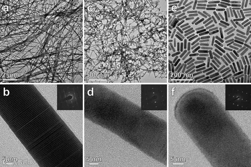 图1. (a,b) 4H金纳米带, (c,d) fcc金纳米线和 (e,f) fcc金纳米棒的透射电镜图。