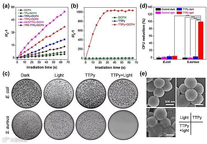 除此之外,此类分子还具有较高的活性氧(ROS)产生效率(图4a)。以TTPy为例,浓度低至1 μM,白光照射30 s后,ROS指示剂DCFH的荧光强度即增强至初始值的1000倍左右,表现出超高的ROS产生效率,远优于现有的商用光敏剂(图 4b)。得益于其超高的ROS产生效率,TTPy能够高效光动力杀伤金黄色葡萄球菌,对大肠杆菌几乎无影响(图4c-e)。