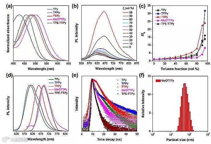 近红外发光的荧光分子在生物应用中具有诸多优势,如穿透力强、对生物体的光损伤小,可避免生物体自发荧光的干扰,且能够大大减小光散射。在目前已有的报道中,近红外AIE分子的合成路径十分复杂,通常需要数步反应和繁琐的分离纯化步骤,这极大限制了AIE分子在生物医学领域的应用。在该工作中,王东副教授团队基于AIE这一创新性概念,通过强供电子基(D)和强吸电子基(A)的有效组合,发展了一系列合成简单、吸收和发射波长逐渐红移的AIE分子,其中TPy、MeOTTPy、TPE-TTPy均具有近红外荧光发射(图1,图2)。