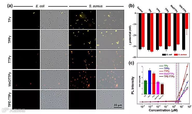 为研究此类分子的细菌成像效果,作者分别选用金黄色葡萄球菌(革兰氏阳性菌)和大肠杆菌(革兰氏阴性菌)为代表。实验结果表明,正电性的AIE分子(TPy、TPPy、TTPy、MeOTTPy)能够选择性地对革兰氏阳性菌染色,对革兰氏阴性菌不染色,这是由于细菌表面负电性及革兰氏阳性菌和阴性菌被膜结构差异导致的(图 3a)。与商用的革兰氏阳性菌特异性荧光探针碘化乙啶HI相比,TTPy具有更优越的光稳定性。值得注意的是,TPE-TTPy对革兰氏阳性菌和阴性菌均不染色。作者对此进行了一系列研究,TPE-TTPy具有较大的空间位阻、较高的脂水分配系数(Clogp,9.02)和较小的临界聚集浓度(CAC,1.8304 μM)(图3c),使得TPE-TTPy不易插入革兰氏阳性菌相对疏松的细胞被膜进行染色,Zeta电势结果进一步证实了以上结论(图3b)。