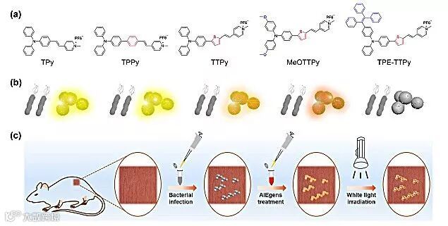 近日,唐本忠院士团队深圳大学AIE研究中心在Journal of the American Chemical Society 上发表论文,报道了一系列能够同时用于革兰氏阳性菌检测与高效光动力杀伤的双功能聚集诱导发光(AIE)材料,系统考察了分子结构与细菌成像和光动力抗菌效果之间的构效关系,并将综合性能优异的近红外聚集诱导发光探针用于大鼠皮肤伤口金黄色葡萄球菌感染的控制。