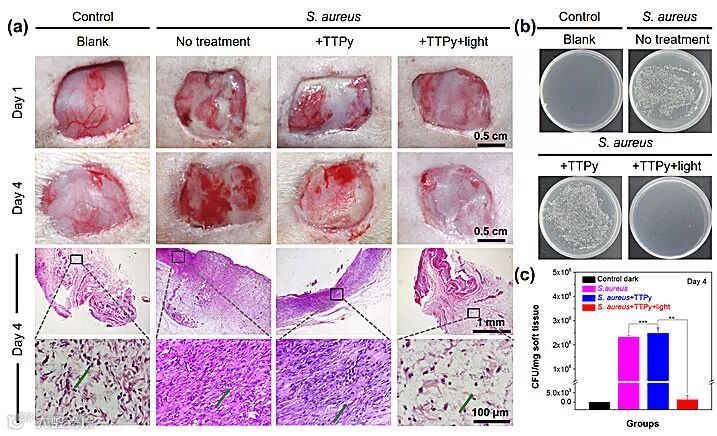 进一步地,作者建立了大鼠背部皮肤金黄色葡萄球菌感染的伤口模型(图5)。各组给予不同处理后,取对应伤口处组织、匀浆、进行细菌培养和菌落计数,结果表明,光动力治疗实验组的细菌菌落数量几乎为零,明显少于对照组。H&E染色结果显示,光动力治疗实验组的中性粒细胞数量明显少于对照组。充分表明了TTPy对于革兰氏阳性菌具有优异的光动力抗菌疗效,能够在体控制金黄色葡萄球菌引起的感染。