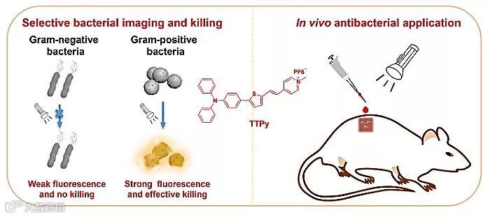 感染性疾病是全球范围内重要的公共卫生问题。细菌感染,尤其是革兰氏阳性菌感染严重威胁人类健康。细菌的快速检测和准确鉴别对于病原菌的检出和临床诊断具有重要作用。荧光成像技术具有灵敏度高、响应快速、背景噪音低、时空分辨率高、操作简单以及非侵入性等诸多优势,已成为当今生命科学领域最重要的技术手段之一。2001年,唐本忠院士首次提出“聚集诱导发光(AIE)”的新概念,引发了发光材料的革命,开启了一个由中国科学家提出并引领的研究新领域。不同于传统的有机荧光染料,AIE材料生物兼容性好、发光效率高、光稳定性好、斯托克斯位移大,可提供荧光“点亮型”检测。AIE材料在生物成像和治疗领域有显著优势,但兼具细菌区分与抗菌作用的长波长AIE材料的开发依然是一个挑战,分子结构与革兰氏阳性菌选择性成像和光动力杀伤效果之间的内在关系并不明朗。