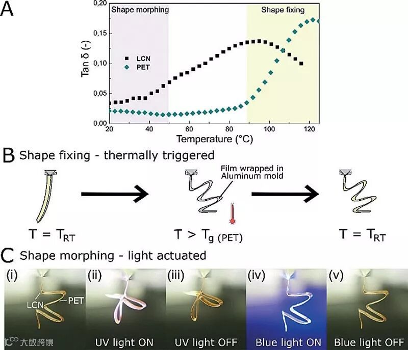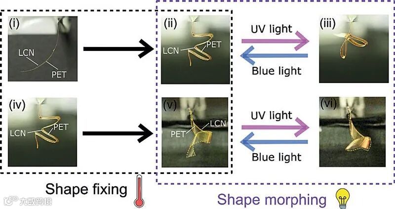 近日,荷兰埃因霍芬理工大学Albert Schenning教授研究团队以热塑性聚对苯二甲酸乙二醇酯(PET)为基底,表面喷涂光响应含偶氮苯液晶网络(LCN),构筑了具有可重复“动作编程”的光致动器件。该新型光致动器件各种初始形状可基于PET重复热定型控制,同一器件在光诱导下可实现“折纸”运动、螺旋运动等多种光致运动。