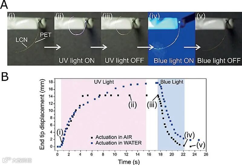 研究团队在预双向拉伸的PET(厚度12 μm)基底上喷涂沉积液晶层(LC,4 μm)构筑双层不对称光致动器件。其中,喷涂后LC混合物在氮气氛围、85 ℃光聚合10 min交联成型,之后130 ℃加热、冷却(至室温)消除LC聚合引起的界面应力。热处理后LCN-PET双层器件呈现小幅度弯曲,在UV(365 nm)和蓝光(455 nm)光诱导下,LCN-PET体系可呈现快速的弯曲运动和可逆恢复;LCN-PET器件光致弯曲速率与单层 LCN光致动器件(厚度>20 μm)光致弯曲速率相当。