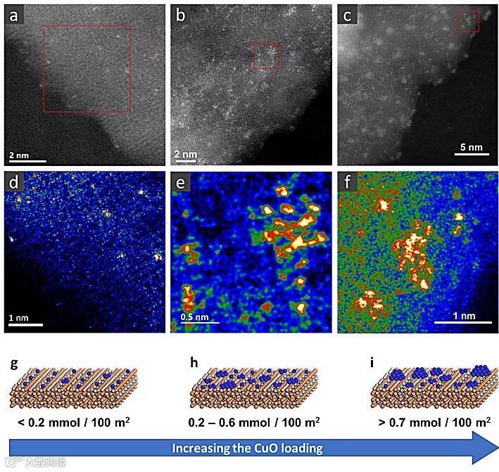 Figure 2. Aberration-corrected high-resolution STEM images of (a) pristine 01CuAl sample, (b) pristine 04CuAl sample and (c) pristine 10CuAl sample. (d), (e) and (f) are the heat maps of the red squares in (a), (b) and (c), respectively. In these heat maps, Cu ions with higher contrast can be easily distinguished from the γ-Al2O3 support. (g), (h) and (i) are the schematic evolution of the size of CuO species supported on γ-Al2O3 with the CuO loading. By tuning the CuO loadings, it is feasible to modulate the majority of CuO species on γ-Al2O3 support, ranging from atomically dispersed Cu2+ species to subnanometric CuO clusters to CuO nanoparticles.
