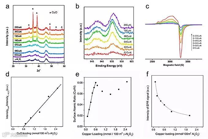 Figure 1. (a) XRD patterns of pristine CuAl samples and γ-Al2O3; (b) XPS of Cu 2p3/2 region of pristine CuAl samples; (c) EPR spectra of 01CuAl and diluted CuAl samples with higher CuO loading; (d) Relative intensity of CuO diffraction peak vs. γ-Al2O3 diffraction peak for various CuAl samples, derived from XRD results; (e) Atomic ratio of Cu to Al in various CuAl samples, calculated based on the XPS results; (f) The EPR signal intensities. The signal intensities are evaluated from twice integration of EPR spectra.