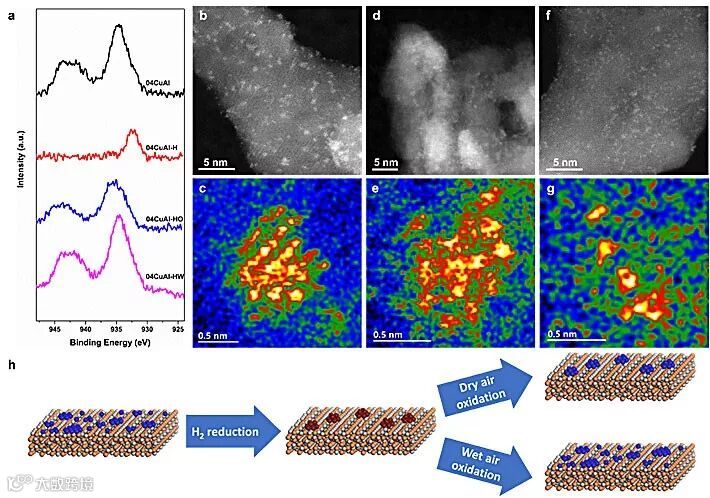 通过对处理前后的不同样品进行AC-STEM表征,可以直接观察到CuO物种分散状态的变化过程(图4)。经还原处理的04CuAl样品中的CuO物种由高度分散态(图2b,e)转为聚集态(图4b,c),干空气氧化并不能使其分散(图4d, e),但湿空气氧化样品中的CuO物种重新实现了高度分散(图4f, g)。原位XPS可以证实样品在氧化还原过程中的电子结构变化(图4a)。值得注意的是,无论光谱还是电镜结果都表明,水汽氧化只能使部分团聚了的CuOx物种重新分散,这可能和较大颗粒的CuO再分散所需能量较高有关。