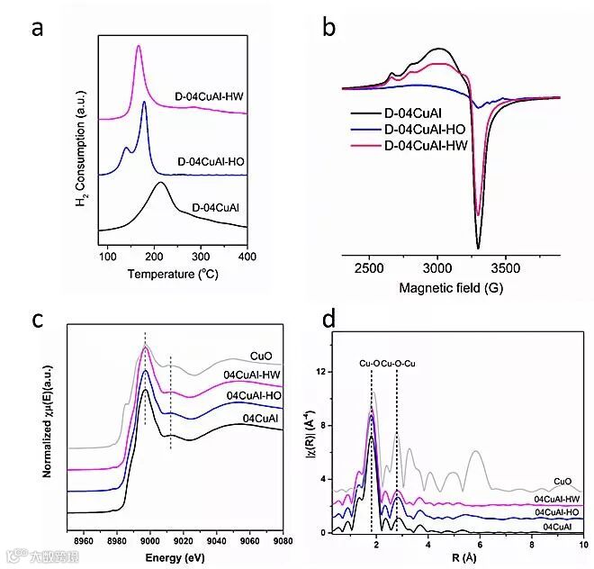 据文献报道,氧化还原处理会影响负载活性组分的分散状态,而水汽在实际工况条件下的催化过程中广泛存在。因此,作者结合这两种普遍的影响因素,考察了在不同处理条件下CuOx物种的动态变化行为。根据TPR、EPR及XAFS表征结果(图3)作者认为,氢气还原处理的样品中,高度分散的CuO被还原的同时发生团聚,并且此团聚态的CuO物种经过干空气氧化处理后无法恢复到初始的分散状态;但若在此重新氧化的过程中引入水汽,可以促使大部分团聚态的表面金属Cu物种重新分散,即原子级分散状态。