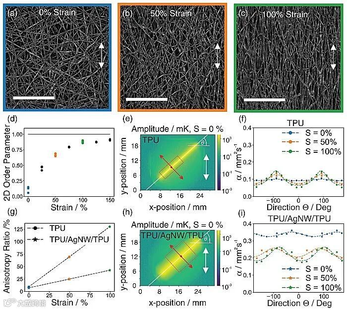 为进一步评估不同应变条件下中间AgNWs导电网络的结构变化,研究团队采用锁相热成像技术对体系热扩散系数进行系统分析。在低应变条件下AgNWs体系呈现高度连续取向结构;高拉伸应变条件下AgNWs体系的热传导呈现各向同性,表明高应变条件下AgNWs导电网络断裂形成了局部孤岛状结构,使得体系导电性降低。