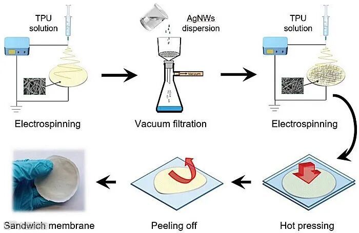 通过将多孔热塑性弹性体与AgNWs导电网络体系复合,研究团队构筑了“三明治”结构高性能、柔性复合导电材料。研究中采用的静电纺丝、抽滤沉积技术便于复合材料体系的大面积制备及分层膜结构精细调控;该复合导电膜体系展现出优异机械性能、柔性及导电性,在智能可穿戴电子器件及软体机器人制造方面具有广阔的应用前景。