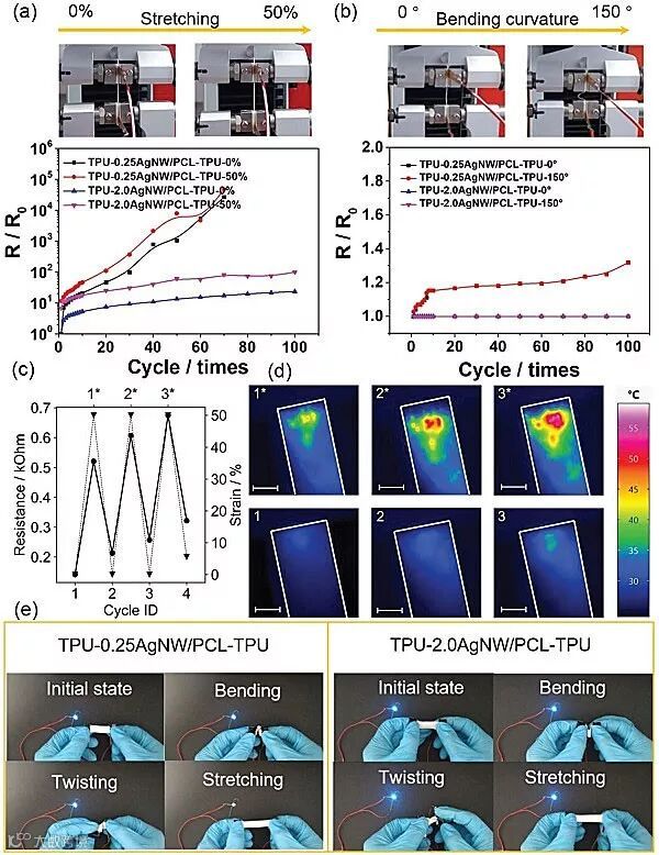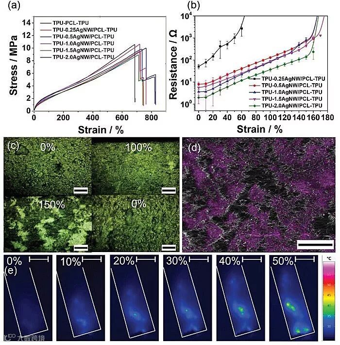 静电纺丝构筑的TPU多孔膜表面电阻高达6.1 ± 0.3 × 108 Ω sq-1,引入AgNWs层后体系电阻可降低至0.09 Ω sq-1;研究表明AgNWs添加量介于0.5- 1.2 wt%时可形成良好导电网络。该复合导电体系具有优异的耐热性,100 °C加热60 h体系导电性能稳定;且复合膜体系展现出优异的透气性。同时,该复合体系的断裂强度达8 MPa、最佳断裂伸长率达700%;体系在不同应变条件下,体系形貌(结构)产生细微变化(<150%应变无裂纹产生),低应变条件下体系导电性能也基本维持稳定。