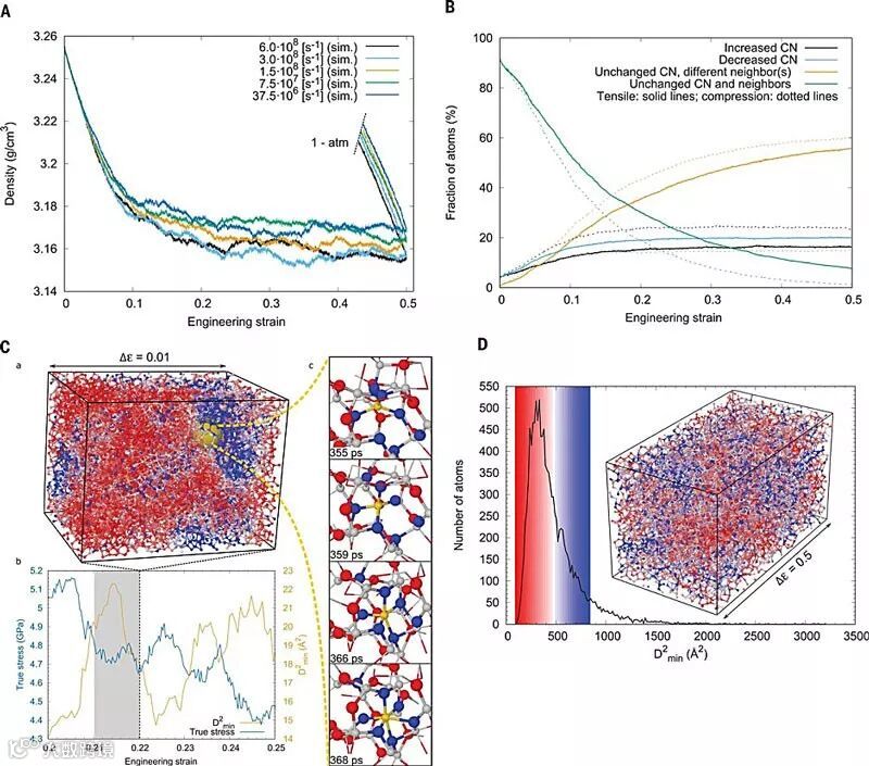 然而,非晶态Al2O3在室温下为何能够发生塑性应变呢?研究者利用材料模型,提出了猜想的原子机理——应变是由原子均匀扩散引起的。在较低应变下,拉伸沿轴向永久伸长;而在较高应变下,塑性变形仅通过稳态粘性蠕变发生。在计算模拟中,这两种形变现象都是通过键切换发生的,相邻化学键在拉伸和压缩过程中随应变的变化改变,键的交换和旋转,产生原子移位,使微观过程累积成宏观的流动性。在传统的认知中,当玻璃温度达到Tg后,产生应力应变不足为奇,然而除了热激活之外,机械激活同样可以独立地诱导玻璃网络的松弛,产生应变。