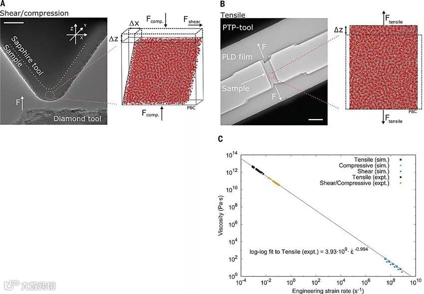 测量非晶态Al2O3粘性行为的实验和模拟程序。图片来源:Science