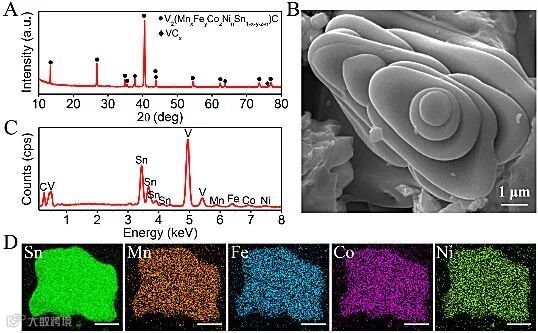 Co、Ni、Mn等具有磁性的元素与Fe具有相似的原子半径和电负性,因此这些元素能够以任意比例或任意组合与Sn金属原子同时进入A位晶格中。实验研究也表明,除了可以合成V2(AxSn1-x)C(A=Fe,Co,Ni或Mn)四种A位含单一磁性元素的MAX相之外,还可以通过排列组合同时引入二元/三元/四元磁性元素(A = FeCo、FeNi、FeMn、CoNi、CoMn、NiMn、FeCoNi、FeCoMn、FeNiMn、CoNiMn或FeCoNiMn),从而成功合成出15种全新纳米层状磁性MAX相材料。多组元磁性元素的同时引入,首次合成出单原子层A位高熵的MAX相材料(图3)。A位磁性元素高熵态的发现说明MAX相具有很好的包容性,也具备了多组元调控的潜力,这对于MAX相材料的M-A化学键调控、晶格缺陷形成能、A位元素剥离化学和c原子平面位错滑移等微观机制都将造成深刻影响。