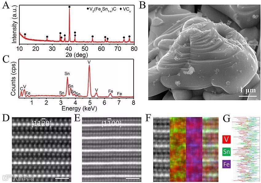 图2. X射线衍射技术揭示出材料具有典型的MAX相晶体结构,与扫描电子显微镜展示的纳米层状独特结构保持一致。扫描透射电子显微图片的原子衬度和能谱分析清晰表明Fe原子分布于MAX相晶体结构中的A位。