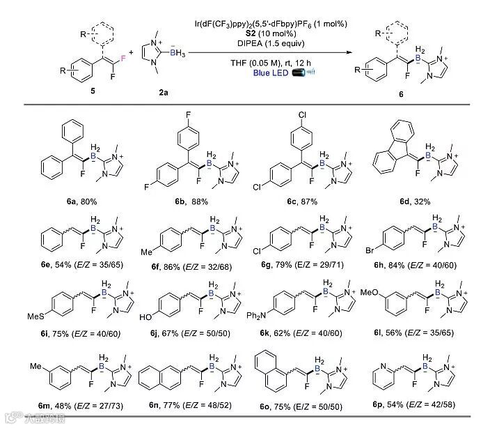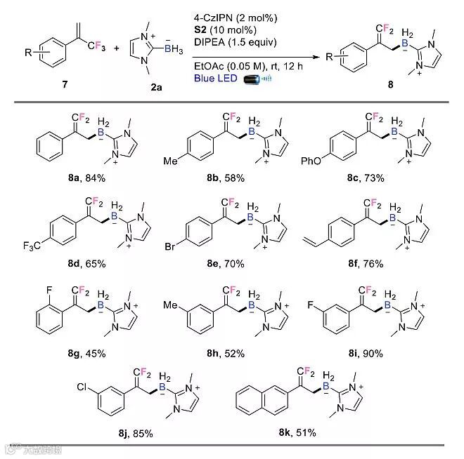 该合成策略也可以拓展到三氟甲基取代烯烃的脱氟硼烷基化反应中,在光催化剂4-CzIPN和HAT催化剂硫醇(S2)的协同作用下,加入碱DIPEA作为添加剂,乙酸乙酯作为溶剂,在室温、蓝光LED照射下,三氟甲基取代烯烃与N-杂环卡宾硼烷反应,得到脱氟硼烷基化产物(图4)。
