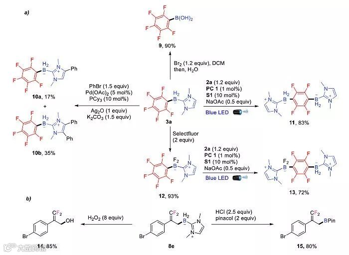 该合成策略可拓展到偕二氟烯烃的脱氟硼烷基化反应中,在光催化剂[Ir(dF(CF3)ppy)2(5,5’-dFbpy)]PF6和HAT催化剂硫醇(S2)的协同作用下,加入碱DIPEA作为添加剂,THF作为溶剂,在室温、蓝光LED照射下,偕二氟烯烃与N-杂环卡宾硼烷反应,得到一系列脱氟硼烷基化产物(图3)。