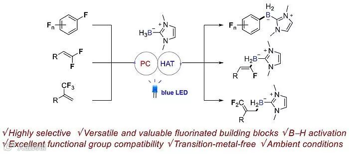 约20%的药物及30%的农药分子中含有碳氟键,而含氟有机分子无法自然合成。所以利用含氟构筑单元合成有机氟化物的研究,日益受到关注。该类化合物在药物、杀虫剂、催化剂和材料等领域有广泛应用。尽管选择性氟化已经取得了极大的进展,但是选择性的合成多氟有机化合物仍然极具挑战。新加坡国立大学化学系的吴杰博士课题组开发了使用光催化剂和氢原子转移催化剂的协同作用,实现N-杂环卡宾硼烷的直接B–H键活化,最终得到多氟有机物脱氟硼烷基化产物(图1)。氟代有机硼烷可以作为构筑多氟有机物的结构单元。