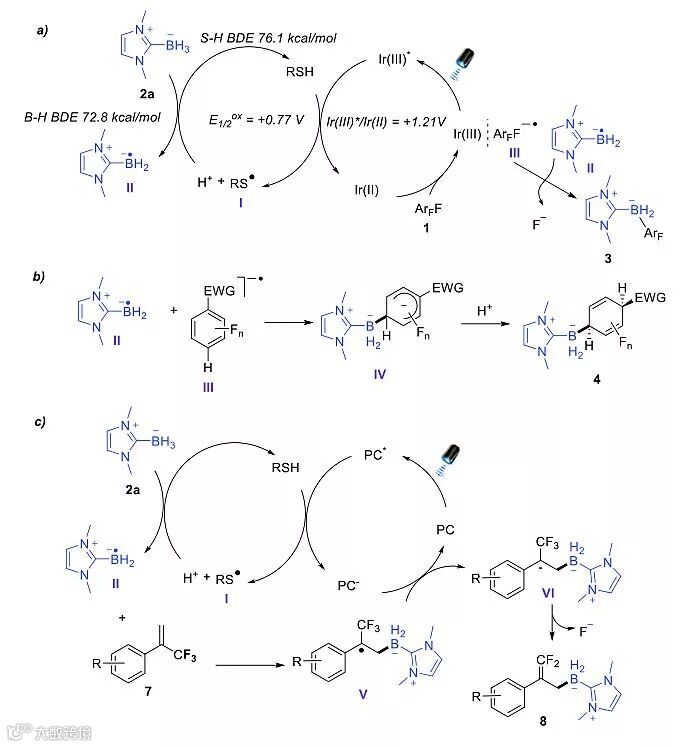 作者对反应机理也进行了研究,根据一系列控制实验、氘代实验、量子产率测试、荧光淬灭实验等结果,提出了反应的催化循环(图5)。在多氟芳烃和偕二氟烯烃的脱氟硼烷基化反应中,光催化剂被激发后,首先将硫醇氧化,得到巯基自由基与还原态的催化剂,该自由基与N-杂环卡宾硼烷反应生成硼基自由基。还原态的催化剂可以被多氟芳烃或偕二氟烯烃氧化,得到多氟芳基自由基负离子,之后与硼基自由基结合,同时脱掉氟负离子,最终得到脱氟硼烷基化产物。多氟芳烃的硼氢化反应产物是通过硼自由基加成到多氟芳基自由基负离子上之后,进行质子化得到的。三氟甲基取代烯烃的脱氟硼烷基化反应中,生成的硼自由基首先与三氟甲基取代烯烃发生加成反应,之后再经过还原,脱除氟负离子得到最终产物。